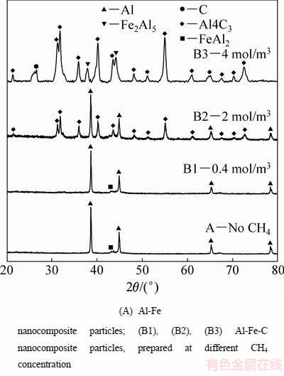 1) 直流电弧等离子体蒸发法是制备Al-Fe/C纳米复合粉体材料的有效方法。当气态碳源—甲烷浓度较小时,粉体中以Al为主相;随着甲烷浓度的增加,单质Al含量逐渐减少,而Al4C3相在增加。