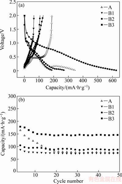 图5所示为样品A、B1、B2和B3纳米复合电极在电流密度为100 mA/g下的首次充放电曲线及其循环性能曲线。从图5(a)中可以看出,样品B3具有最高的首次放电容量628.8 mA·h/g,循环50次后容量保持在146.2 mA·h/g;样品A、B1和B2首次放电容量分别为348.8、193.3和275.5 mA·h/g,循环50次后容量保持在75.8、74.7和88.3 mA·h/g。由此可见,4种纳米粉体复合电极的循环性能由大到小依次为B3>B2>A>B1,表明复合粉体中碳物质的存在有利于提高循环稳定性能,同时,活性金属化合物Fe2Al5相的形成有利于提高充放电容量和抑制体积变化,也将有利于提高大电流密度下的功率性能[24]。由图5(b)可知,样品A初始容量大于样品B1,而50次循环后两者容量差异较小。由图3(b2)可知,样品B1粒子形貌呈棒状,增加了Li离子的扩散距离,嵌锂反应未能完全进行,使得其初始的容量较小。同时,样品B1中C含量非常低,对改善电极循环稳定性的作用较小。