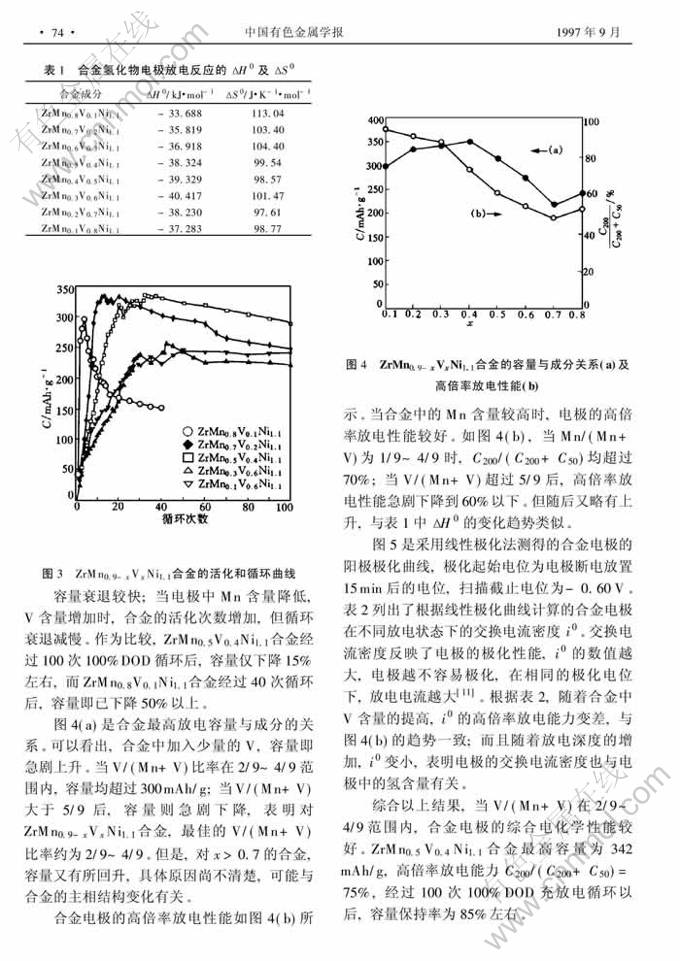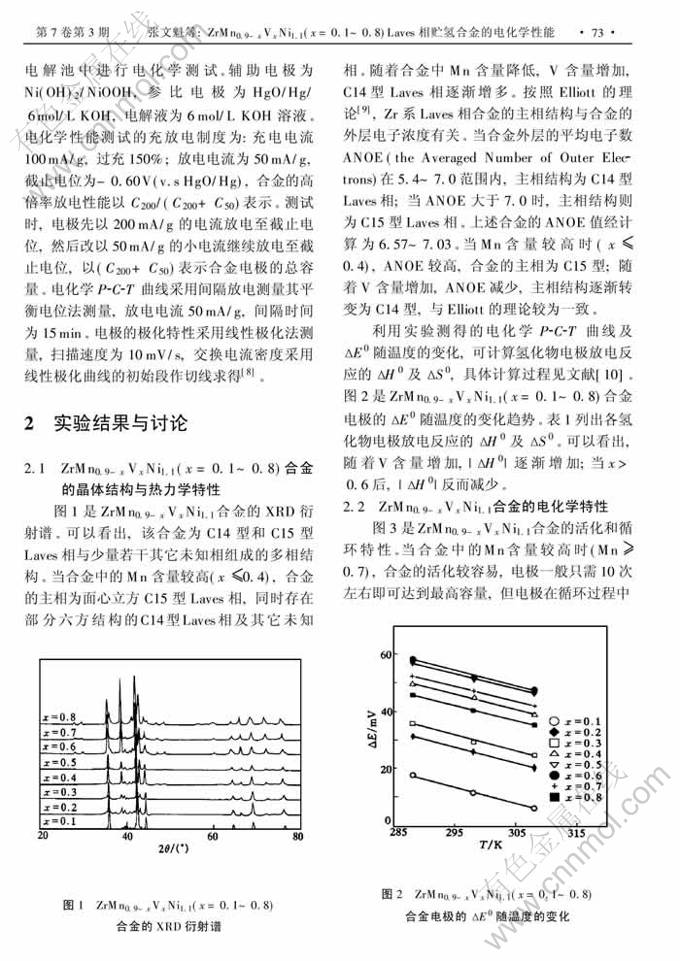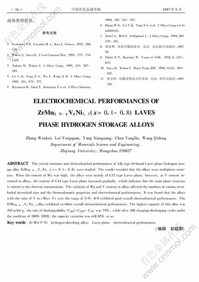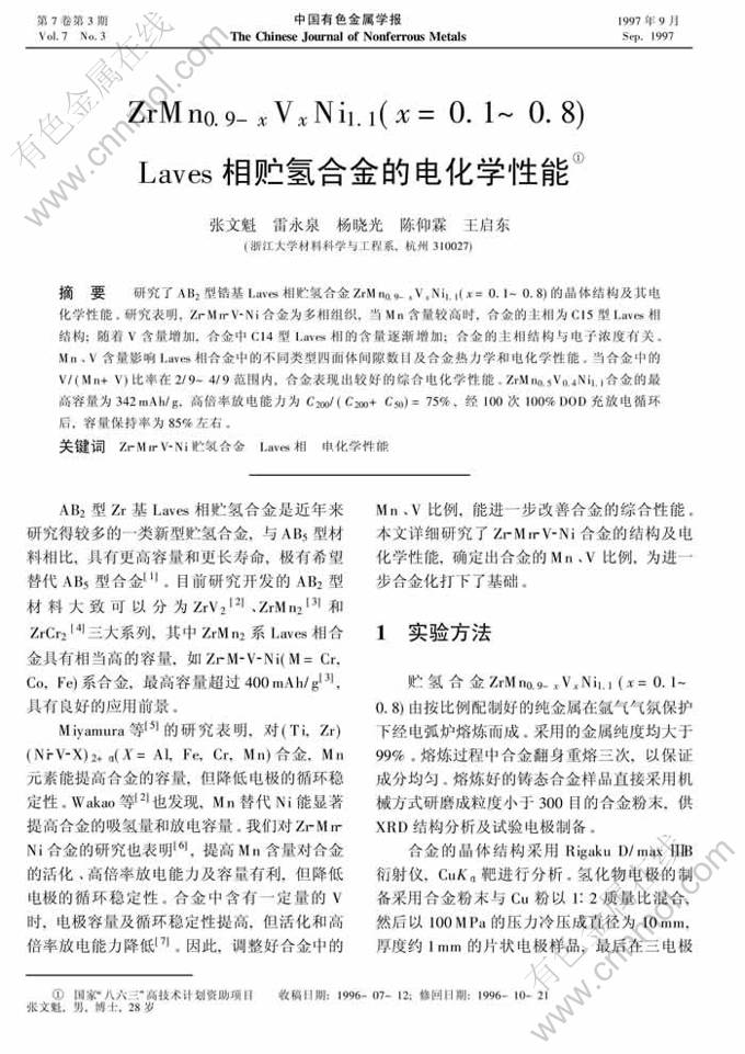 Key words:Zr-Mn-V-Ni hydrogen-absorbing alloys Laves phase electrochemical performances