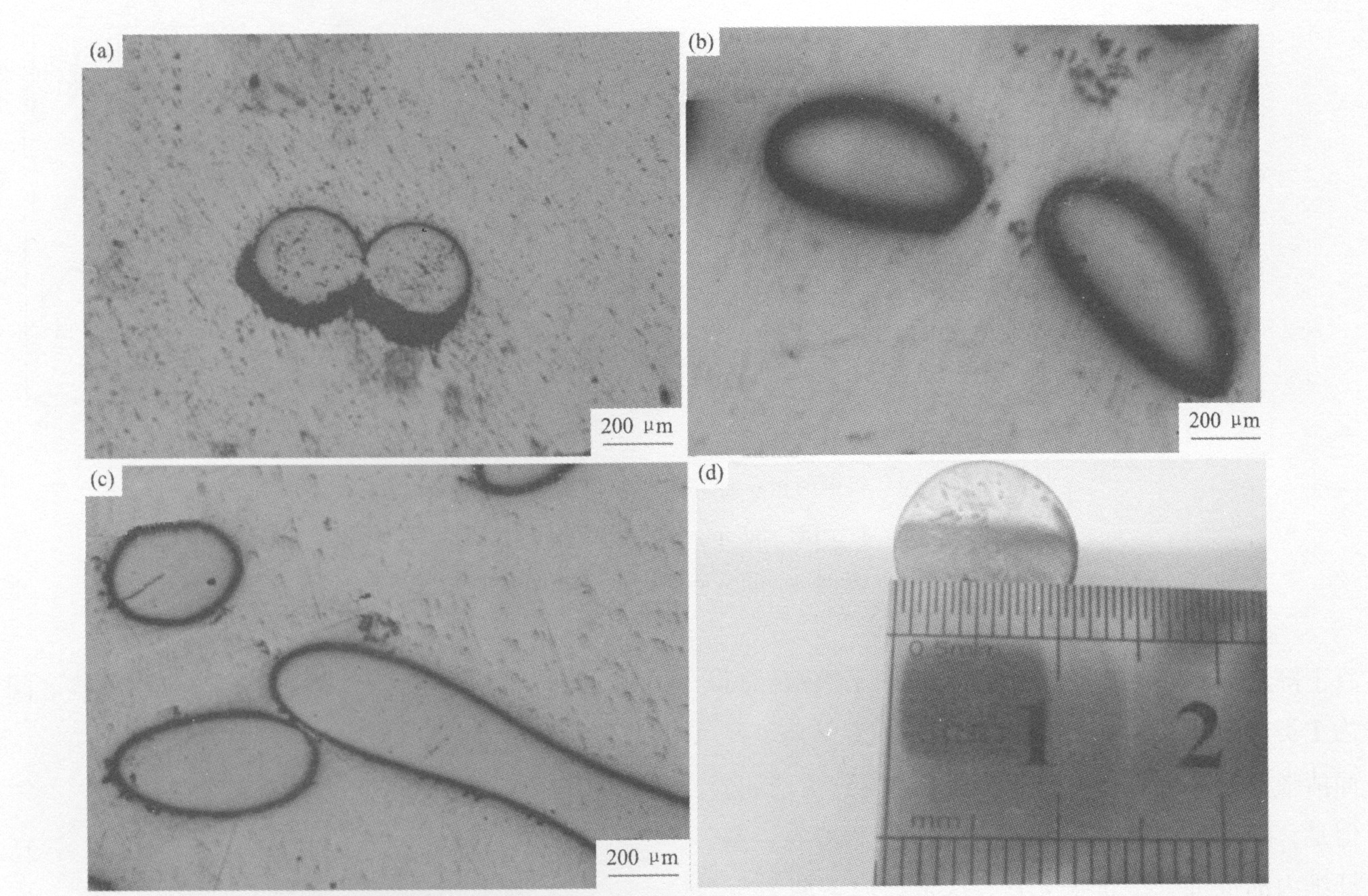 图3为纤维不同排布方式所制得的钨纤维增强铜基复合材料的显微组织。 图3(a)为单向平行排布, 图3(b)为涡卷状排布, 图3(c)和(d)为空间螺旋网状排布的显微组织照片和宏观照片。 黑色不规则圆圈包围的部分为钨纤维, 大部分灰色区域为铜基体。
