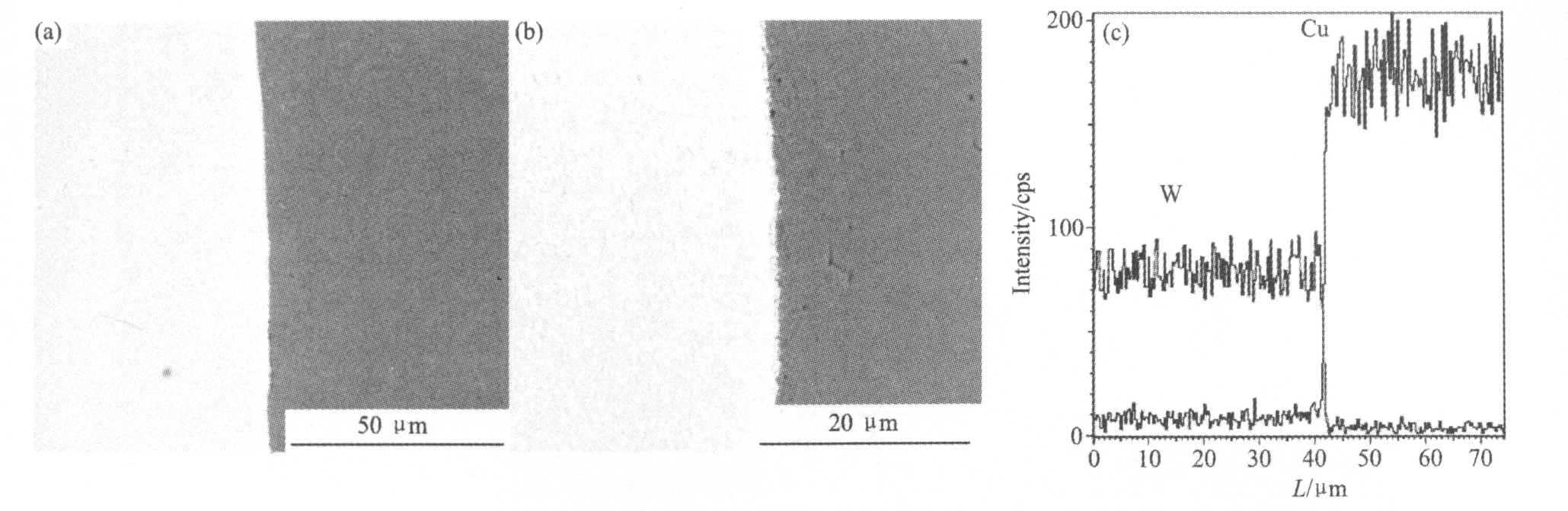 直下降趋势, 含量几乎降至为零, 证明了钨铜界面为Ⅰ类界面, 钨铜两相既不反应也不相互溶解, 界面清晰, 这一点在SEM照片分析中也得到了论证。 但是, 在铜基体内, 有含量极低的钨元素存在, 钨纤维内部也可见微量铜元素, 这是高温下两者少量相互扩散的结果, 扩散区只有几个微米宽。