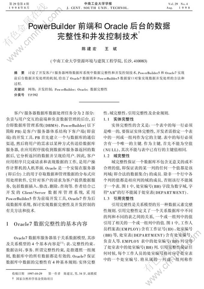 关键词:网络;并发控制;PowerBuilder;Oracle;数据完整性