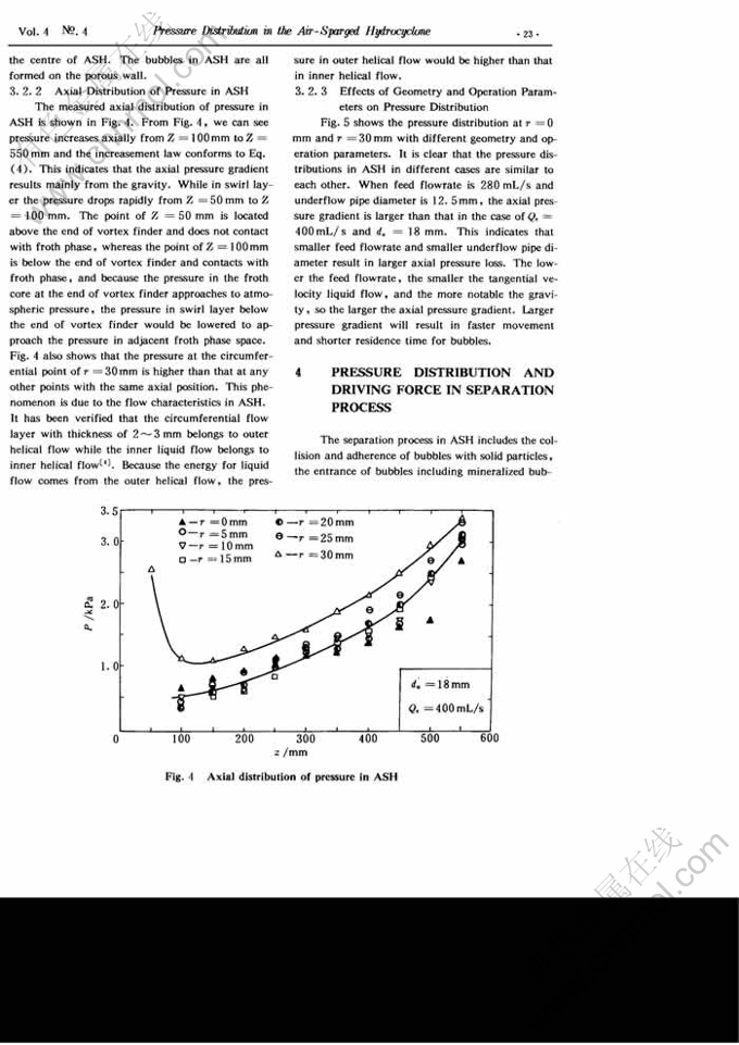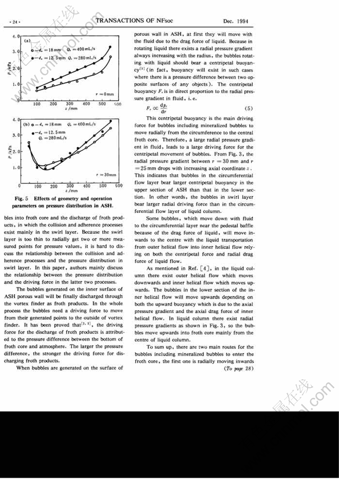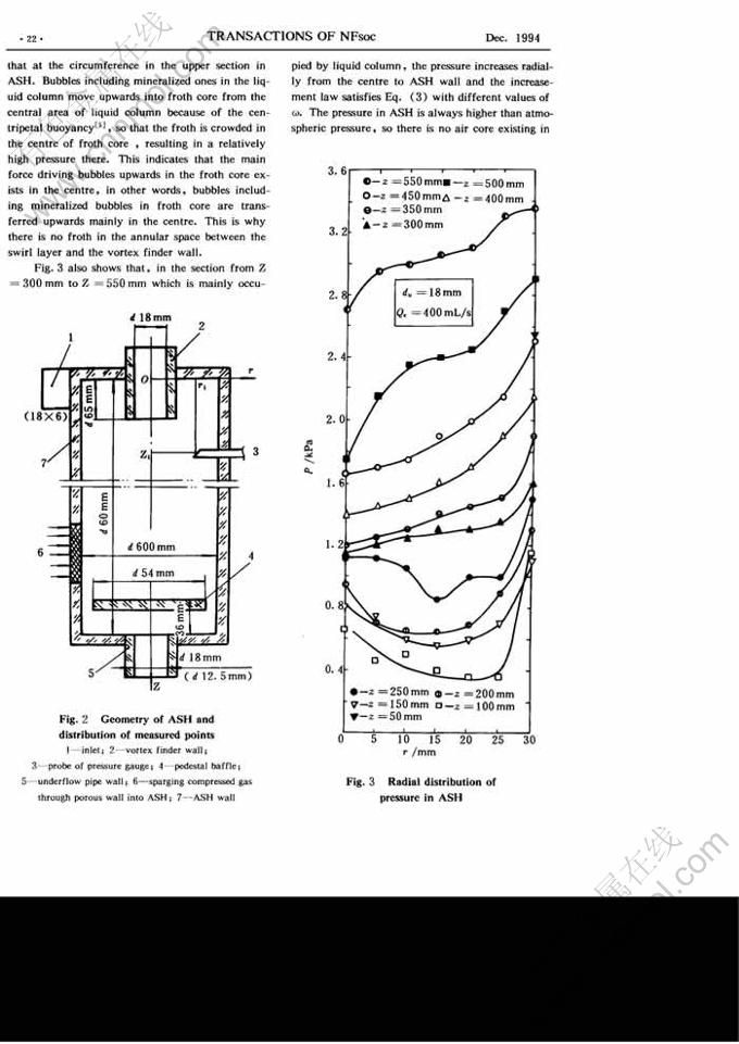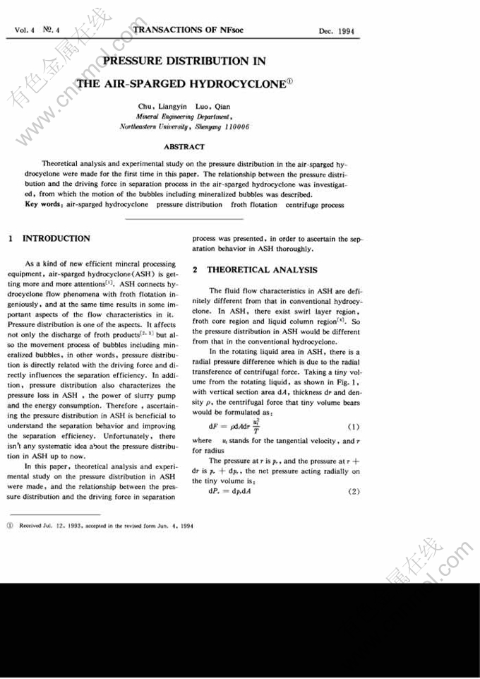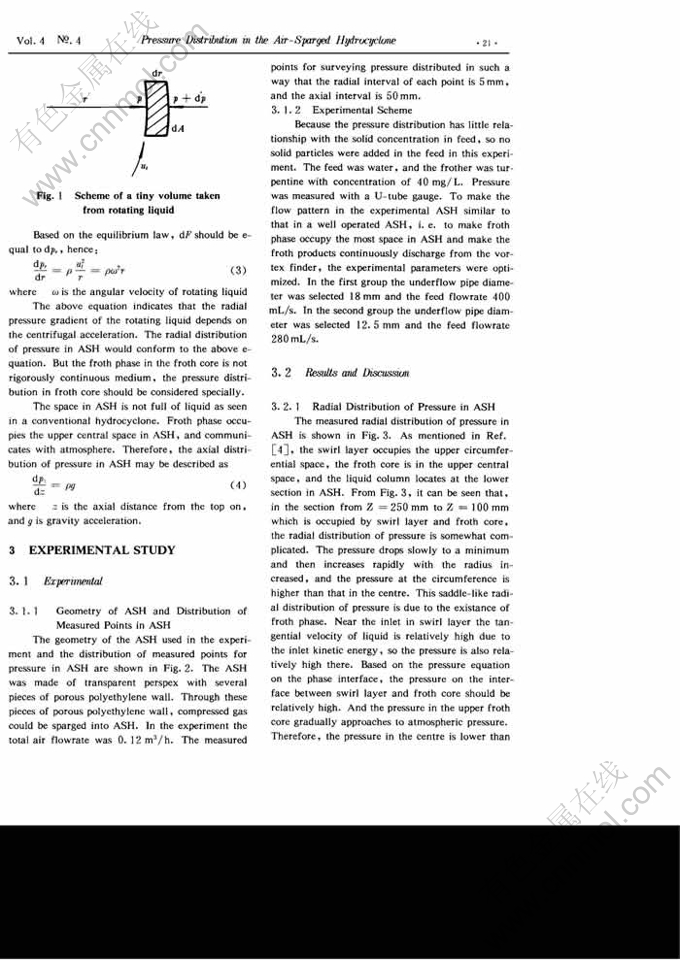 Abstract: Theoretical analysis and experimental study on the pressure distribution in the air-sparged hydrocyclone were made for the first time in this paper. The relationship between the pressure distribution and the driving force in separation process in the air-sparged hydrocyclone was investigated, from which the motion of the bubbles including mineralized bubbles was described.