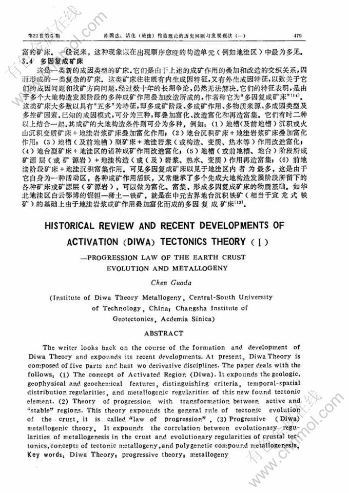 Abstract: The writer looks back on the course of the formation and development ofDiwa Theory and expounds its recent developments. At present, Diwa Theory iscomposed of five parts and hast wo derivative disciplines. The paper deals with thefollows: (1) The concept of Activated. Region (Diwa). It expounds the geologic,geophysical and geochenical features, distinguishing criteria, temporal-spatialdistribution regularities, and metallogenic regularities of this new found tectonicelement. (2) Theory of progression with transformation between active and"stable" regions. This theory expounds the general rule of tectonic evolution of the crust, it is called "law of progression" . (3) Progressive (Diwa)netallogenic theory. It expounds the correlation between evolutionary regu-1arities of metallogenesis in the crust and evolutionary regularities of crustal tectonics, concepts of tectonic netallogeny, and polygenetic compound metallogenesis.