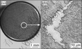 Fig.3 Metallographs of defect in TC4 alloy: (a) Low magnification; (b) High magnification
