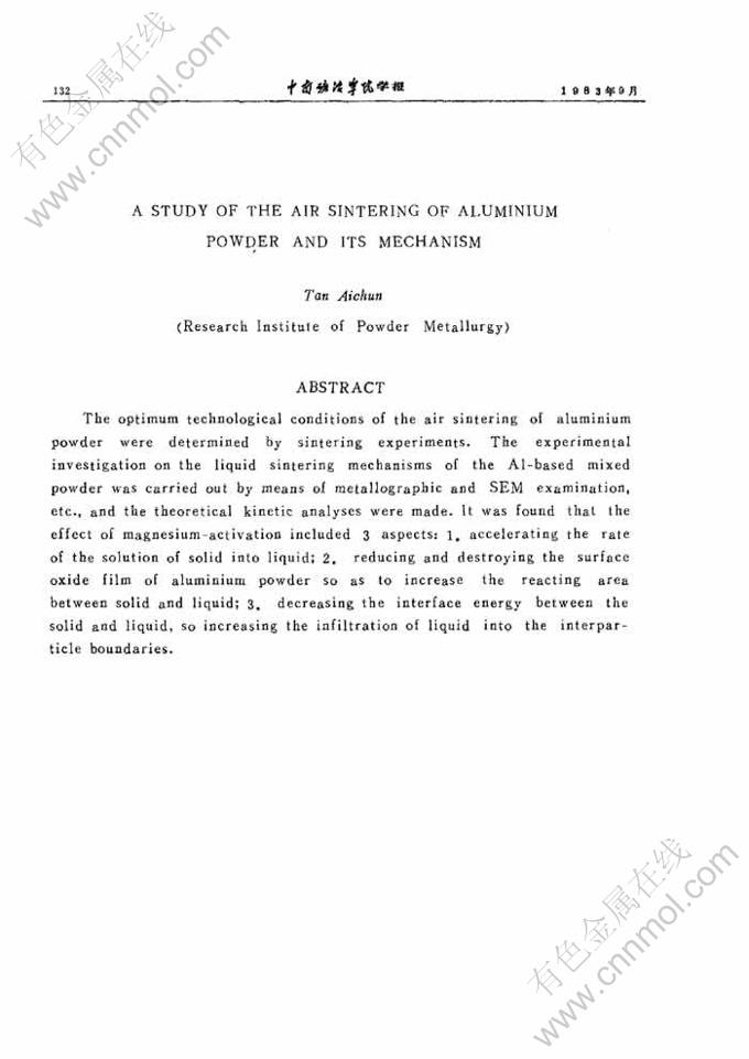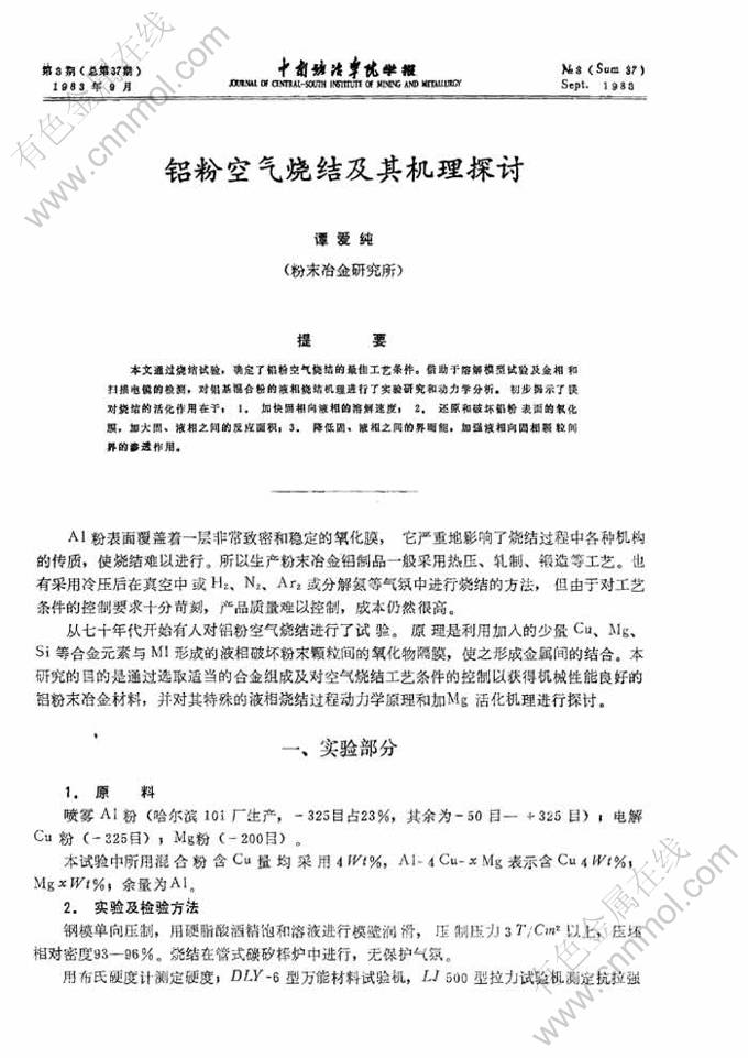 关键词:空气烧结; 液相出现温度; 机理探讨; 氧化膜; 烧结温度; 保温时间; 铝粉; 烧结时间; 烧结过程; 液相量