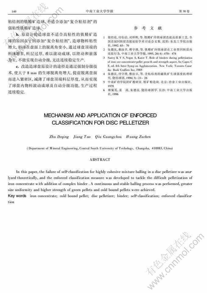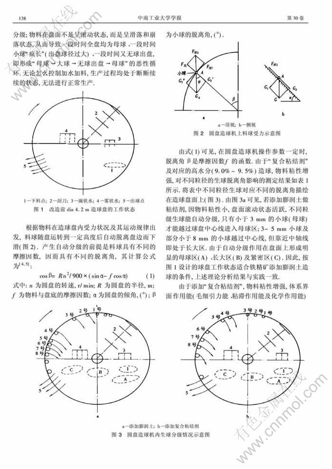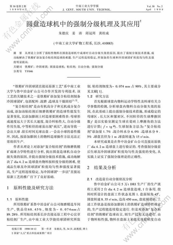 关键词:铁精矿;冷固球团;圆盘造球机;粘结剂;自动分级;强制分级
