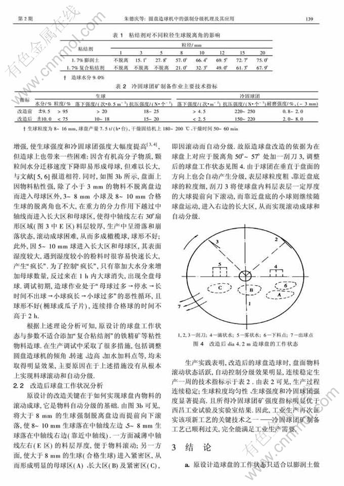 摘 要:从理论上分析了强粘性物料在圆盘造球机中成球时自动分级失效的原因,提出了强制分级技术措施,成功地解决了铁精矿添加复合粘结剂造球的难题.生产过程连续稳定,所制备的生球和冷固球团矿粒度均匀性及强度明显提高.