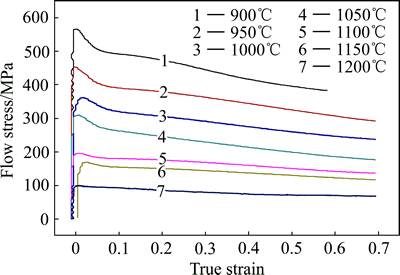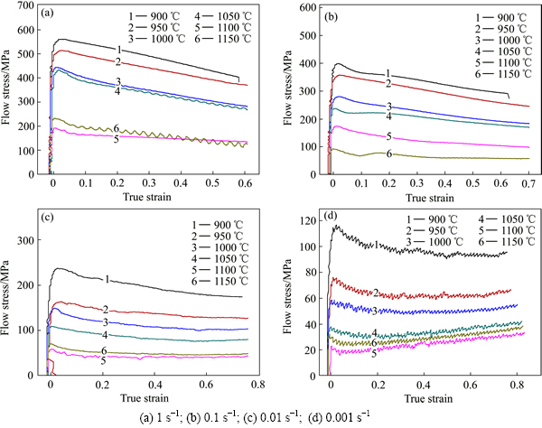 1) 当应变速率一定时,变形温度越高,流变应力越小(1100和1150 ℃与此规律不符,推测与此温度区间内合金中的碳化物第二相的溶解现象有关[6])。这是因为随着变形温度的升高,原子的平均动能增大,位错运动和晶面滑移更加容易,另外,动态回复和动态再结晶也更容易进行,使得材料位错密度下降,抵消了塑性变形产生的加工硬化,促使流变应力降低。