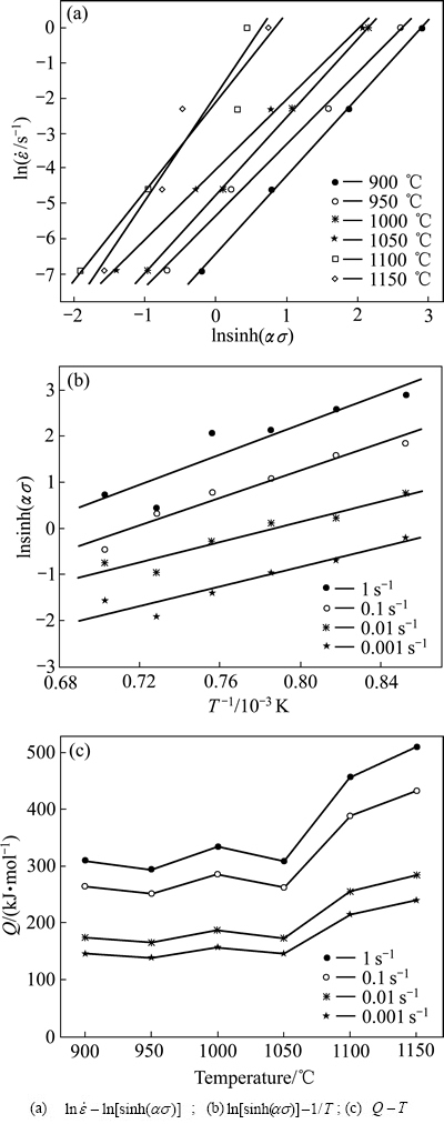 关系曲线,如图4(a)所示,直线的斜率即为n值。对式(4)进行整理,可以得到式(5),当应变速率为常数时,假定一定温度范围内Q值保持不变,将变形温度及各变形温度对应的峰值应力分别代入,可绘制得到合金的