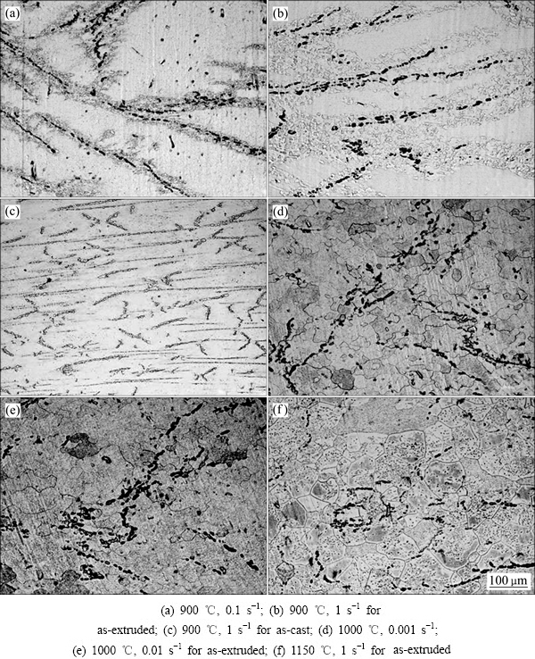 ROBERTSON等[16]报道纯钛β相的自扩散激活能为153 kJ/mol,本文作者计算得到挤压态阻燃钛合金的平均变形激活能为258.3 kJ/mol,与纯β-Ti的自扩散激活能比较接近,说明挤压态阻燃钛合金高温变形是扩散控制的过程,动态回复是主要的软化机制。但计算所得258.3 kJ/mol与自扩散激活能153 kJ/mol相比还是稍高,说明变形过程中会有动态再结晶发生。图4(c)所示当应变速率为0.1和1 s-1,变形温度为1100和1150 ℃时,变形激活能达到400 kJ/mol以上,远高于153 kJ/mol,可以认为主要软化机制已经是动态再结晶了。