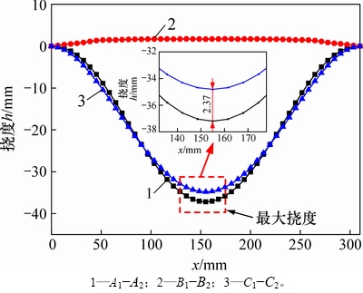式(5)仅计算了筛面中点的最大挠度,而由图4可以看出:筛面实际工作条件中各个位置挠度并不完全一致。为此,利用单元路径映射功能,分别提取筛面A1-A2,B1-B2和C1-C2这3处位置的挠度,其中B1-B2处为筛面弯折的圆弧中点,A1-A2和C1-C2在距离上关于B1-B2对称,映射路径具体位置如图5所示。筛面不同位置的挠度-位置曲线如图6所示。从图6可以看出:筛面挠度关于筛面几何中心线呈对称分布,筛面弯折部分B1-B2处的挠度明显小于平直部分A1-A2和C1-C2处的挠度,其最大挠度为1.7 mm,仅为筛面中点最大挠度的4.37%,而远离弯折部位的区域C1-C2处的挠度与平直部分A1-A2的挠度相近,两者最大差值为2.37 mm。由此可见,筛面各部分挠度差异导致的相对错动是弯折部位产生内应力的重要因素。