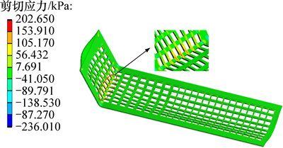 基于2.1节中的有限元计算结果,绘制最大应力状态下筛面的剪切应力分布云图,如图7所示。从图7可以看出:筛面弯折区域属于高剪切应力分布区,最大剪切应力为202.65 kPa,远高于平直段部分的剪切应力,同时筛孔边缘等效应力较大,存在应力集中现象,这也与筛面现场实际破坏情况一致,说明有限元应力分析结果较可信。