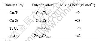 式中:?H1、?H2、?H3和?H4分别为Cu73Ti27、Cu62Zr38、Ti77Co23和Zr78.5Co21.5的混合热。