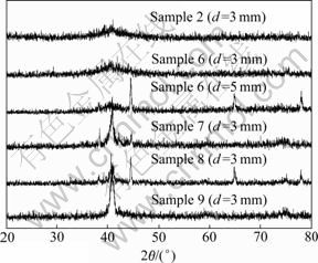 从图2可以看出,直径为3 mm的样品6的XRD谱在2θ=41°附近仅有一个漫射峰,而直径增大到5 mm时,XRD谱中出现尖锐的晶化峰;而样品7、8、9的XRD谱中都出现了明显的晶化峰。由此可知:样品6成分也能形成直径为3 mm的完全非晶结构。