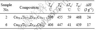 此前有关CuTiZrCo非晶合金的报道甚少,LOUZGUINE和INOVE[15]利用Co取代Cu改进Cu60Zr30Ti10非晶成分得到Cu55Zr30Ti10Co5合金,通过铜模铸造法只能形成直径为2 mm的非晶圆棒。ZHANG等[17]将Co加入到Cu60Zr30Ti10 非晶合金中,得到(Cu60Zr30Ti10)100-xCox(x=0~5)系列合金中也只能形成最大直径为3 mm的非晶圆棒,?Tx最大为54 K。研究表明:样品2能形成直径为3 mm的非晶圆棒,且?Tx=59 K,是目前报道的CuTiZrCo合金中非晶形成能力强且含Co量最高的合金。