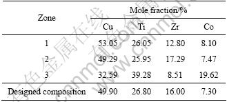 由二元相图得到Cu-Ti、Cu-Zr、Ti-Co和Zr-Co的深共晶点,表1所列为各元素之间的混合热。用式(1)[16]求出各共晶点合金的比例系数Ci,确定各元素的组成,得到合金成分为Cu50.4Ti27.1Zr16.2Co6.3。然后微调共晶点的比例系数,设计出一系列的合金成分如表2所列。