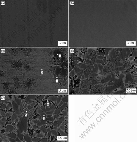 图7(a)和图7(b)所示是直径5 mm的不完全非晶态组织的样品6和2的高倍表面形貌。从图7 (a)中可以看出,除基体(图中1区)外,依稀出现第二相区(图中2区),将2区放大(见图7(c)),可以看出,2区中有沿晶界析出的白色细小颗粒。图7(b)中表明2#样品存在3种主要的相组织(见图6中3,4和5区),比图7(a)所示的6#合金中的第二相更多。为进一步研究这些区域的成分,对图6中3,4和5区进行EDS分析,结果如表7所列。