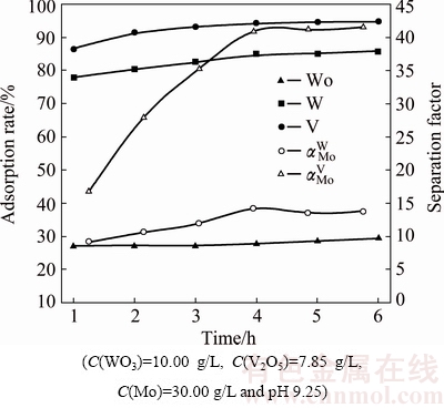 The adsorption rates of W and V approached 84% and 94% as the Mo/W and Mo/V molar ratios exceeded 40, respectively. The separation factors also increased to high levels: to approximately 45 and