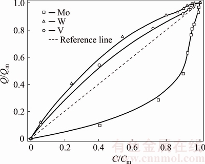 The experimental data from the equilibrium adsorption isotherms are shown in Fig. 4. The equilibrium adsorption capacities of W, V and Mo increased with increasing metal concentrations. The adsorption isotherm value for W and V was obviously higher than that for Mo, which indicated a stronger affinity of D403 toward W and V over Mo.