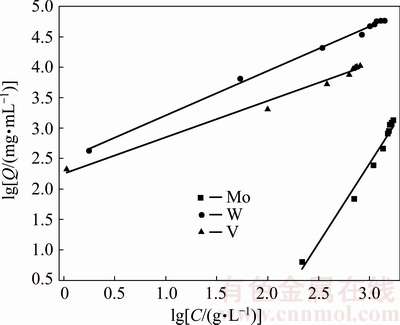 Fig. 5 Freundlich isotherm plot of W, V and Mo on D403 resin
