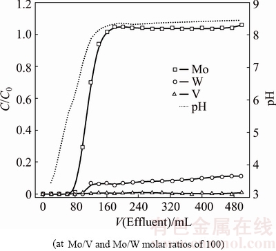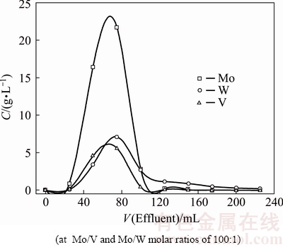 The elution-column experiments were investigated using 1 mol/L sodium hydroxide solutions. The results are shown in Fig. 7. The elution tendency of these metals was similar in solutions, and the concentrations of tungsten, vanadium and molybdenum in effluents reached peaks at approximately 60-80 mL. The average molar ratios in the effluent of W/Mo and V/Mo approached 0.152 and 0.136, respectively, compared with initial ratios of 0.01.