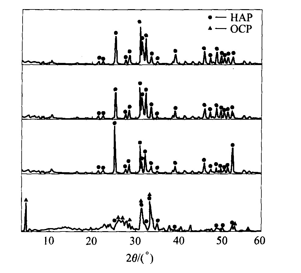 Abstract: In order to further understand the formation mechanism of natural bone and to prepare better biomimetic biomaterials with high performance, three kinds of self-assemble organic films with different head groups and three kinds of inorganic ions existing in the body fluid, were used to study the growth behavior of HAP crystal by X-ray diffraction(XRD), scanning electron microscopy(SEM). The results show that, 1) the presence of organic films can accelerate the HAP crystal nucleation, but different organic film can induce HAP crystal with different growth style and crystal morphology. The HAP induced by the film with —NH2 head groups is the nano-platelet crystal with regular orientation and order array. On the film with —SO32- head groups, radiated growth style of HAP crystal is mediated. While the HAP crystal induced by the film with —PO43- head groups has neither regular orientation nor order growth style. 2) The inorganic ions of the calcification solution play great roles in controlling HAP crystal growth rate and morphology. Platelet-shape HAP crystal is always formed in the presence of Cl- ions by exchanging site with OH- ions. Mg2+ ions can inhabite the HAP crystal nucleation and growth rate due to Mg2+ taking up the nucleation site of organic film or the growth site of HAP surface, while in the presence of SO42- ions, HAP crystal grows with the style of cluster shape and its size is very little due to SO42- ions absorbing on the surface of HAP crystal.