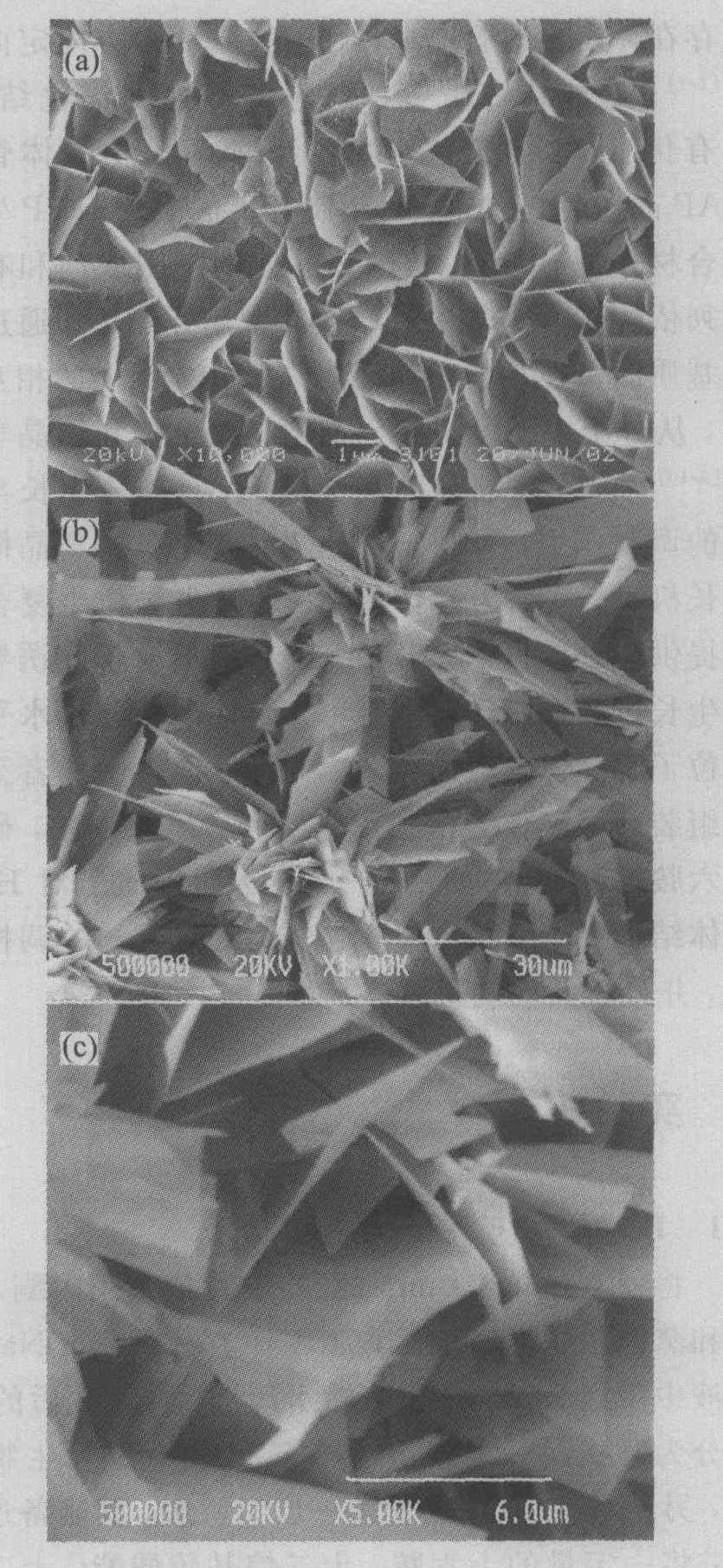 图2 不同有机膜存在下形成的 HAP晶体的SEM形貌 Fig.2 SEM morphologies of HAP crystal grown on different organic films (a)—Hexadecylamine film; (b)—Dodecylvitriolic ester film; (c)—Dodecylphosphatic ester film