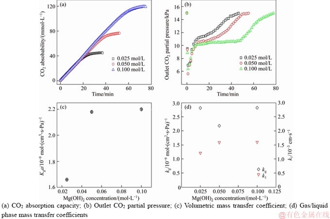 CO2 has attracted global attention on climate change and been widely discussed as a special kind of pollutant. Coal-fired power plant and biomass gas are the main sources of carbon dioxide emissions, different fuel varieties and carbon contents lead to the difference of CO2 partial pressure in flue gas. The proportion of CO2 in the flue gas of coal-fired power plants accounts for 10%–20% and biomass gas for 12%–30%, which is adverse to combustion and decreases calorific value [1, 2]. In these carbon capture and sequestration (CCS) technologies, chemical absorption is regarded as the most direct and efficient way [3]. Monoethanolamine (MEA), ammonia and potassium carbonate (K2CO3) are common absorbent selections for CO2 capture, but they all have defects of varying degrees, such as the corrosivity and toxicity of MEA solution and high energy consumption [4], high running cost [5], the high volatile nature of ammonia [6] and the precipitation of ammonia carbonate salts [7]. Academia and industry are still studying new decarbonizing agents with low energy consumption, high capture rate and low cost. Mg(OH)2 is referred as CO2 capture agent for its low price, relatively low energy consumption and property of not easy to encrust [8].Wet magnesium method decarbonization technology is derived from limestone and dolomite wet desulphurization technology in flue gas desulfurization (FGD) [8]. Its basic principle is that Mg(OH)2, as decarbonization agent, absorbs carbon dioxide and converts it into magnesium bicarbonate solution, which is heated in the desorption tower to regenerate magnesium hydroxide over and over again. The bubble column reactor is widely used for mass transfer and chemical reactions of wet magnesium method decarbonization because of its simple structure and excellent performance [9]. Through gas bubbler installed at the bottom of the bubble column, CO2 gas is dispersed into small bubbles, then reacts with Mg(OH)2 slurries to enhance the absorption efficiency, which is equivalent to reducing mass transfer resistance when it applies to industrial production. Therefore, it is essential to study the mass transfer process of the CO2-H2O-Mg(OH)2 system. In general, the presence of chemical reactions will enhance mass transfer of the liquid-solid interface, and gas-liquid interfacial mass transfer becomes the determining step of the transfer process [10]. A continuous bubble column scrubber was used to capture CO2 gas by using a NaOH solution under a constant pH operation, the higher values of overall mass-transfer coefficient and absorption efficiency were required to give smaller gas-liquid molar rate ratio [11]. Absorption of CO2 into Piperazine (Pz) solution was investigated by PASHAEI et al [12], total gas phase mass transfer coefficient (Kg) and liquid side mass transfer coefficient increases with the Piperazine concentration and CO2 partial pressure. Most studies on the mass transfer behavior were limited to determine the volumetric mass transfer coefficient, Kga. Nevertheless, the volumetric mass transfer coefficient was not enough to describe the mass transfer mechanism [13]. Further, the calculation of mass transfer rate and specific surface area of phase boundary is helpful to understand the limiting factors of mass transfer process.