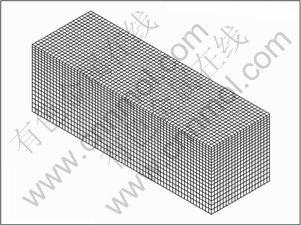 创建长为3倍磨削弧长、宽和高均为10 mm的实体模型并进行网格划分[12-13],单元类型选用三维8节点六面体单元,即Solid70单元。由于工件表面的温度梯度较大,为相变发生区域,对精度要求较高,所以在划分网格时实体模型表面层的网格划分得更细密一些,随着深度的增加,网格越稀疏,这样既能保证对工件表层进行精确的计算分析,又可以节约计算量,减少系统的数据存储空间。网格划分结果如图3所示。