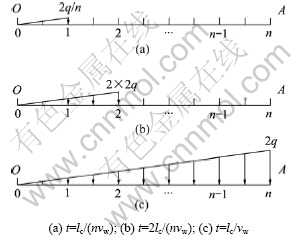 划分为n段,可以将0至t的时间段也划分为n段,从t=0时刻起,01段上有热源强度斜率为2q/lc的斜坡载荷作用;从t=lc/(nvw)时刻起,12段上作用有同样斜率的斜坡载荷作用;依此类推,从t=(n-1)lc/(nvw)时刻起,(n-1)n段上作用有同样斜率的斜坡载荷作用。依据求解时间步,将三角形分布热源载荷等效到节点上,依次求解各个载荷步,即可求得t=lc/Vw时刻工件上得温度分布。