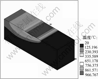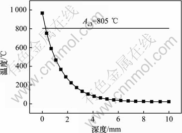 图5所示为温度场分布等值线图。从图5可以看出:工件表面温度最高达到966.767 ℃,并且在一定深度处都达到了表面淬火的温度要求,随着深度的增加温度逐渐降低。