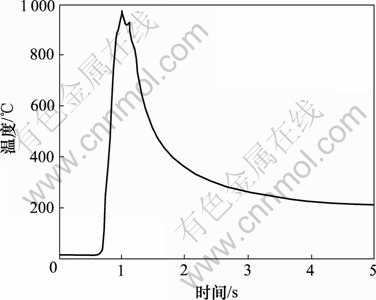 图6所示为工件表面单点温度的变化。从图6可以看出:当热源移动到该位置时,温度迅速上升并达到966.767 ℃,随着热源的离开,温度又迅速下降到300 ℃以下,整个过程在2 s左右完成,具有加热温度高、保温时间短和下降迅速的特点,满足表面淬火的要求。