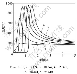 Fig.7 Temperature variation of points along length direction on workpiece surface