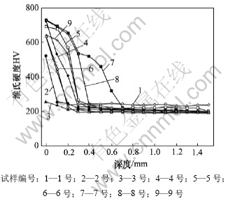 Fig.9 Microhardness distribution curves of grind-hardening samples