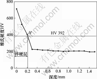 45钢经表面淬火后硬度要求一般为HRC 40~50,认为硬度大于HRC 40(HV 392)时即为淬硬。图10所示为4号试样显微硬度的分布。在图上画一条显微硬度为HV 392的水平直线,该直线同硬度分布曲线交点H的横坐标即为淬硬层深度,由此可以得到工件的磨削淬硬层深度试验值约为0.26 mm。将仿真值同试验值进行比较得到其误差为7.69%,精度较高,预测结果有效可靠,说明利用有限元法对磨削温度场进行数值仿真及对淬硬层深度进行预测是可行的,对磨削淬硬的试验研究具有指导意义。