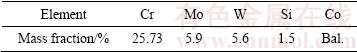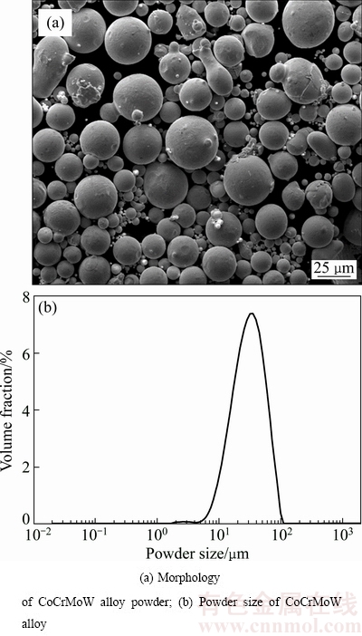 本实验采用气雾化制备的CoCrMoW合金粉末为原材料,其化学成分如表1所列,粉末形貌和粒度分布如图1所示。由图1可知,所使用的钴铬钼钨合金粉末球形度较高,粉末粒度较集中,平均粒径为28.7 μm。