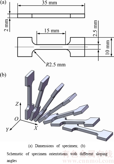 利用华南理工大学自主研发的Dimetal-100激光选区熔化设备进行成形。在三维建模软件中设计并绘制出需要加工的拉伸试样,导出STL格式文件后在Magics15.01中进行零件排布、添加支撑和切片处理。图2所示为试样尺寸及试样摆放角度示意图,7组试样的摆放方向分别与成形平面成0°、15°、30°、45°、60°、75°、90°。经正交试验优化后,选用的成形工艺参数为激光功率P=160 W,扫描速度v=400 mm/s,扫描间距h=0.08 mm,加工层厚t=0.025 mm,扫描策略为正交层错扫描方式。成形过程中采用316L不锈钢作为基板材料,氩气作为保护气体。