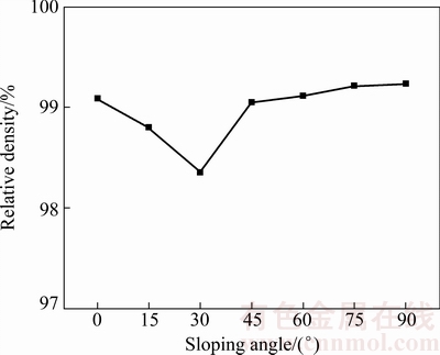 成形角度对试样的相对密度的影响如图3所示,由图3可见:随着倾斜角的增大,成形试样相对密度呈现先减小后增大的趋势,其中,倾斜角为90°时试样密度最高,相对密度达到99.2%,倾斜角度为30°时密度最低,相对密度为98.4%。