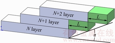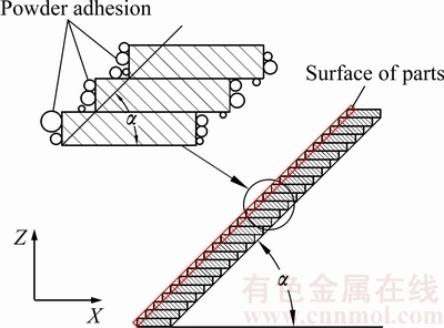 倾斜角在15°到90°间的试样表面质量较0°试样的差,主要是受成形过程中台阶现象以及表面颗粒粘附的影响。图7所示为台阶效应及粉末粘附的示意图,倾斜摆放的试样在成形过程中,相邻两层之间相对错开了一定距离,导致表面出现高低不平的现象。在层厚一定的前提下,倾斜角越小,相邻两层之间错开距离越大,台阶现象越明显,表面质量越差,这是15°~75°成形试样表面质量相对较差的主要原因。