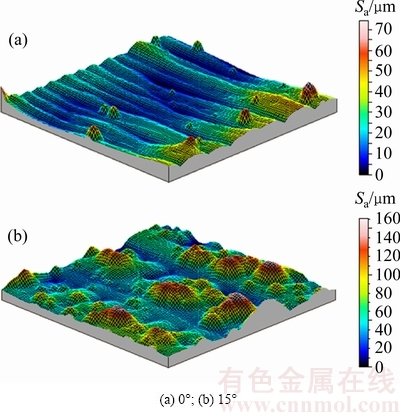 成形倾斜角对试样上表面粗糙度(表面轮廓算数平均偏差Sa)的影响如图5所示。随着倾斜角的增加,表面粗糙度大致呈现先增加后减小的趋势,在0°时为最小值7.84 μm,在15°时达到最大值19.85 μm,图6即为0°和15°的表面区域形貌示意图。
