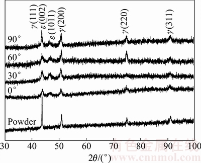 图9所示为CoCrMoW合金粉末和成形试样的XRD分析结果,可以看出,CoCrMoW合金粉末由FCC的γ相组成,而SLM成形的CoCrMoW合金由FCC结构的γ相和HCP结构的ε相组成。在SLM成形过程中,粉末在激光的作用下快速熔化形成熔池,激光移开后,熔池急速冷却形成γ相,同时抑制了凝固过程中ε相的形成。但SLM是一个逐层成形的过程,在每一层的成形过程中,激光以较高能量同时作用在粉末和实体上,使粉末熔化的同时也对粉末底部的实体进行加热和熔化,这个过程等同于对已成形区域中受加热而未重新熔化的区域进行了热处理,为ε相的形成提供了条件。从XRD分析结果还可以看出,不同角度所包含的两种相含量有所不同,但差距不明显。
