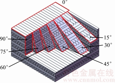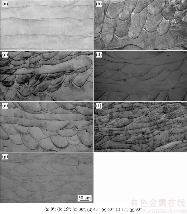 图10所示为光学显微镜下不同倾斜角度成形试样的上表面金相组织,可以看到:0°试样的熔道方向为水平方向,而15°到90°的试样出现两个方向上的熔道,且随着倾斜角度增加,熔道深度大致上呈递减趋势,熔接线数量呈增加趋势,这是由成形样品的摆放倾斜角不同引起的。不同角度的熔道边界大致可以看成将三维堆积的熔道剖切后露出的熔道之间的熔接线,其示意图如图11所示,可以看出,其熔道深度及熔接线数量随角度变化的变化规律与得到的金相组织一致。