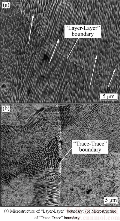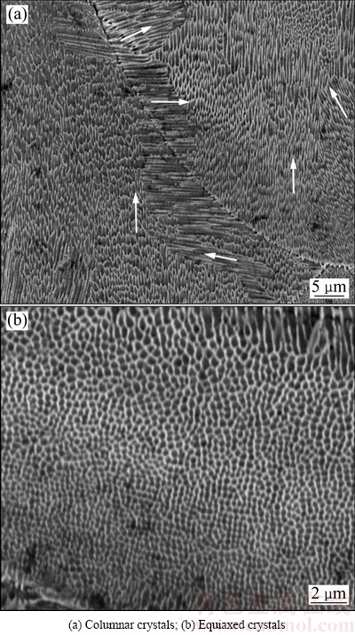 图12所示为成形零件在扫描电镜下的柱状晶和等轴晶两种不同组织,不同成形角度试样中都含有这两种组织。由图12(b)可以看出,其等轴晶组织晶粒细小均匀,晶粒尺寸在1 μm以下。在SLM成形过程中,高能量的激光束作用在粉末上并快速离开,使粉末在短时间内熔化并快速冷却,因而形成的晶粒细小。从图12(a)中还可以看出,晶体沿多个方向生长(图中箭头为晶粒生长方向),这是由于SLM成形过程中,激光的扫描路径受计算机系统控制形成移动的热源,同时激光扫描时也会使已成形的实体发生重熔,使传热过程产生复杂的变化,从而使晶体沿着多个方向散热,最终导致试样内部出现非平衡的微观结构。
