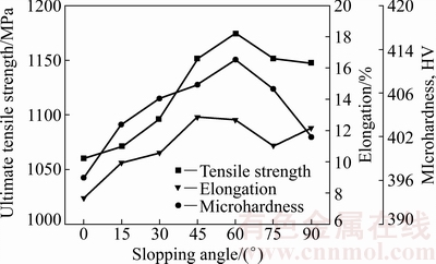 Fig. 13 Effects of sloping angle on ultimate tensile strength, elongation and microhardness