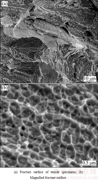 不同成形倾斜角的拉伸断口形貌基本一致,图15所示为试样的拉伸断口形貌,从图15(a)可以看出,其断面具有明显的解理小平面和撕裂棱,具有凹凸不平的层错台阶,解理面的放大图可以观察到断口含有大量细小韧窝,如图15(b)所示,表明材料具有一定的韧性,材料的断裂特性属于准解理断裂。