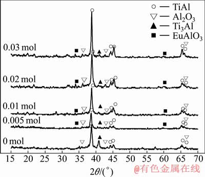 从图2中可以看出:Ti-Al-TiO2系统和掺Eu系统的主晶相均由TiAl、Ti3Al和Al2O3相组成,掺Eu系统中还生成了EuAlO第二增强相。第二增强相的衍射峰强度与Eu2O3的添加量呈正比关系。