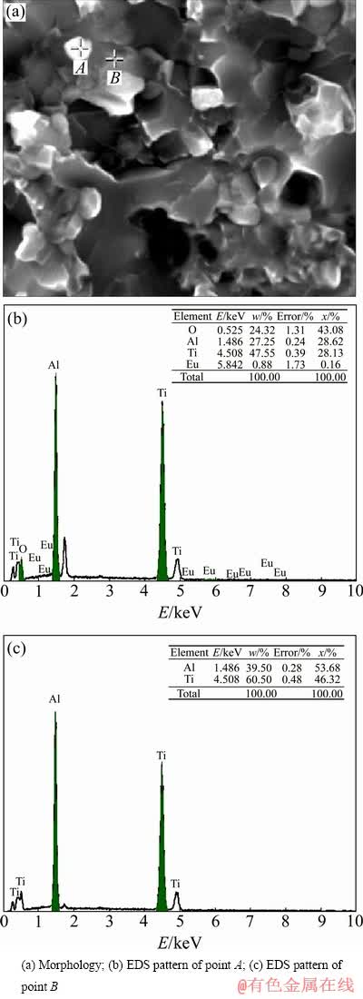 图3所示为含Eu体系的断口形貌和EDS分析图谱。从图3中可以看出,材料主要由暗色的TiAl基体部分和亮色的增强相部分组成,亮色增强相分基体布在晶界处,起到阻碍基体长大、细化晶粒的作用[8]。