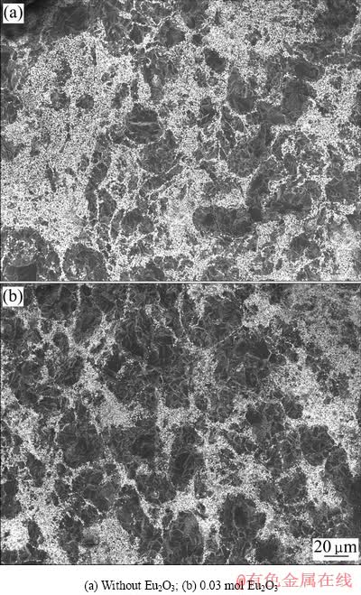可以发现,材料的断口主要由黑色基体和白色增强体部分组成,图4(a)中,白色增强体团聚比较明显,存在较大的黑色基体区域;图4(b)中反应物Eu2O3的引入使复合材料增强相粒子的分布情况也发生了变化,变成了弥散型分布。材料中生成的增强相承现连续、均匀的空间网络结构,网络结构之间包裹着的基体晶粒也变小,大大减弱了晶粒的团聚现象[5]。且断口表面高低不平,说明断裂时路径曲折,需要消耗更多的断裂能[9-10]。