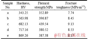 不同配合料分别以乙醇为保护介质,采用湿法混料。球磨过程的各项参数分别如下:粉料、氧化铝球石和无水乙醇的质量比为1:3:1,球磨机的转速为800 r/min,球磨时间为1 h。球磨后的粉料进行干燥,过筛(筛孔直径为75 μm)后,装入密封袋备用。将混合粉料装入内径为12 mm的高强钢磨具中,并在20 MPa的压力下预压。将所压制的圆片装入模型内,周围用Al2O3包裹,将石磨纸作为隔垫物,压实,然后一并放入ZT(Y)系列真空热压碳管炉中进行热压烧结。将烧结所得的试样在磨盘上打磨除去表面层,以备物理性能及其他性能测试使用。为了制备符合力学性能测试标准的样品,选用孔径为30 mm的石墨模型,称取15 g混合粉料装入其中。装完后将石墨模型置入真空热压碳管炉内,采用真空热压烧结。烧结温度达到1 250 ℃,压力调节至25 MPa,然后在此压力和温度条件下保温2 h后随炉自然冷却。合成的试样打磨去除表面层,以备性能测试用。